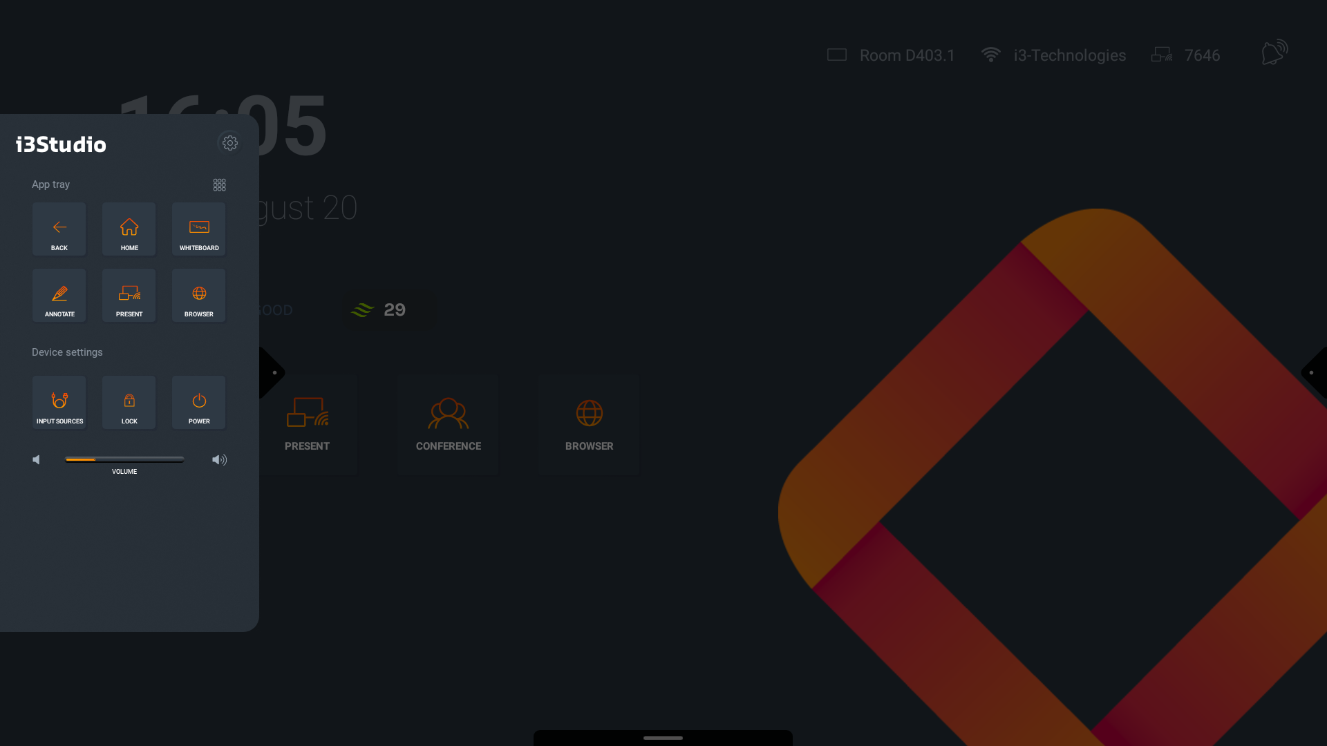 Cambia el volumen o silencia tocando el icono del altavoz izquierdo. Es posible que también tengas la opción de ajustar el brillo de tu pantalla i3TOUCH aquí.