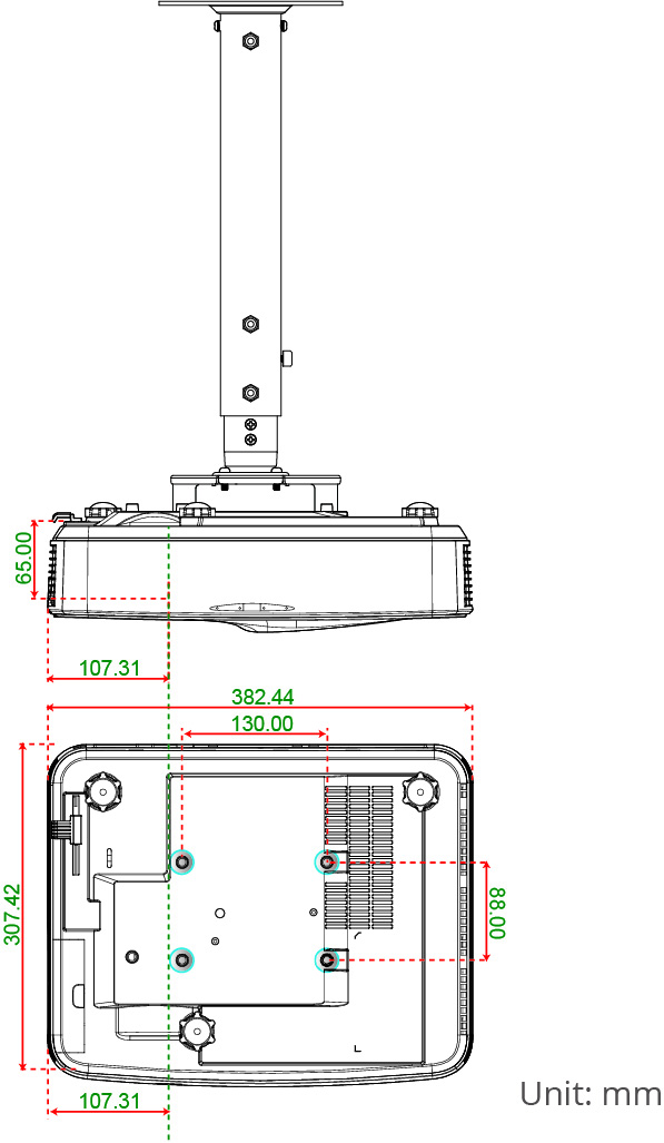 If you wish to use a third party ceiling mount kit, please ensure the screws used to attach a mount to the projector meet the following specifications: