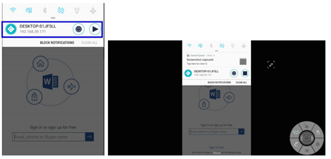 Deslice el dedo hacia abajo desde la parte superior de la pantalla para mostrar la barra de notificaciones. Pulse el botón Reproducir para empezar a compartir la pantalla. Puede ver el uso compartido de la pantalla en el receptor i3ALLSYNC.
