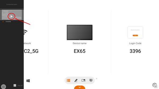 Sélectionnez l'émetteur connecté à l’aide du bouton Lecture dans la « Liste des utilisateurs » pour démarrer la duplication d'écran (recliquez sur l'icône « Liste des utilisateurs » ou cliquez en dehors de la barre pour masquer la liste).