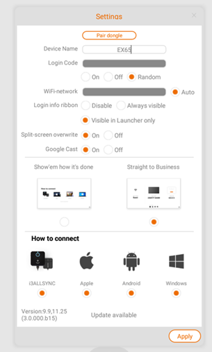 Ruban d’information de connexion | Le ruban d'information flottant vous permet de vous connecter à i3ALLSYNC sans ouvrir l'application Récepteur. Désactivé = désactive cette fonction. Toujours visible = le ruban flottant apparaît lorsque l'affichage se concentre sur d'autres applications ou sources d'entrée. Visible uniquement dans le lanceur = le ruban flottant n'apparaît que lorsque l’écran affiche uniquement i3Launcher. |