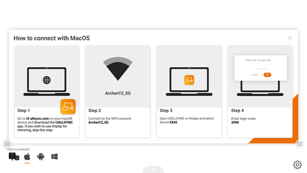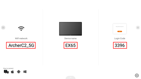 Der i3ALLSYNC-Transmitter (= die i3ALLSYNC-App auf Ihrem Laptop oder Smartphone) sollte mit demselben Netzwerk verbunden sein wie der i3ALLSYNC-Receiver (= i3ALLSYNC auf Ihrem i3TOUCH EX, PX und ES). Sie können sich auf die Informationen auf dem Standby-Bildschirm des i3ALLSYNC-Receiver beziehen.