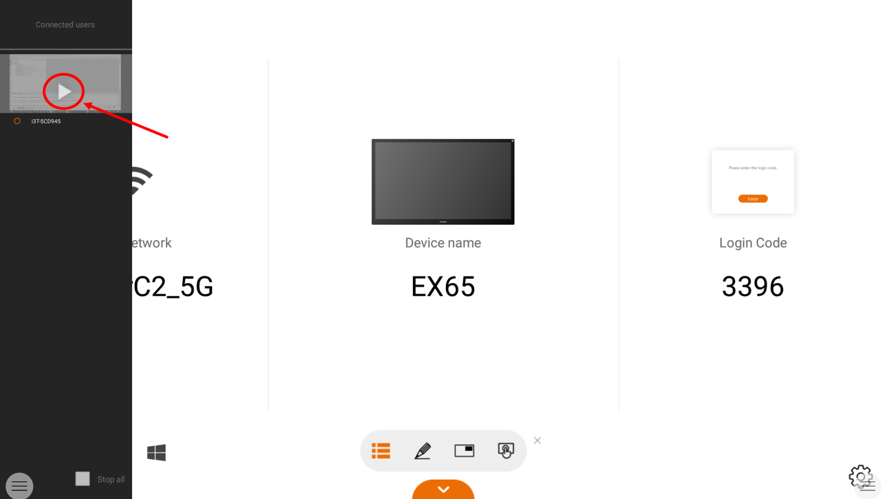 Select the connected transmitter with the Play button on the ‘User List’ to start screen mirroring. (Click the ‘User List’ icon again or click outside the bar to hide the ‘User List’)