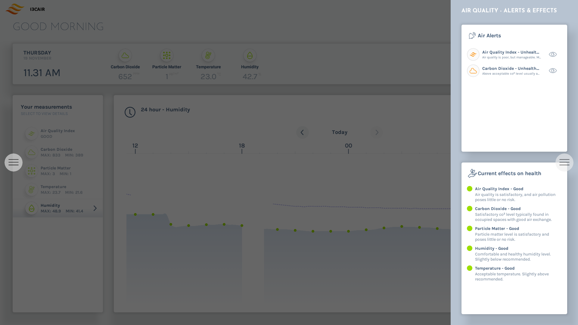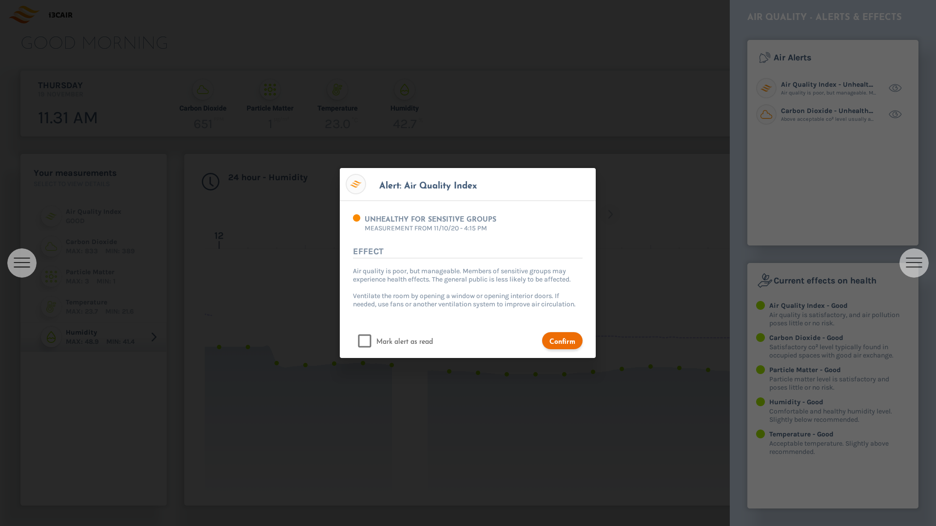 Below the alerts list are detailed explanations for the current sensor value readouts and what the possible current effects on health in the room are.