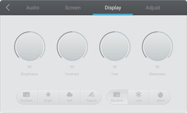 Select a preset configuration to adjust the brightness, contrast, hue, and sharpness of the image, or manually set a custom configuration.
