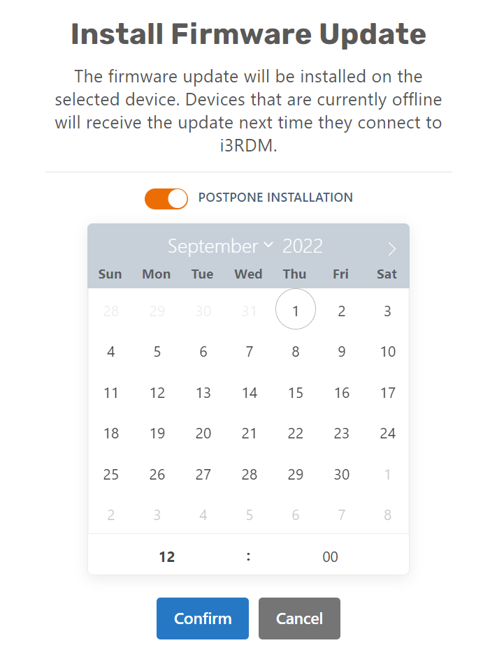 Klicken Sie im Dialogfeld auf die Schaltfläche „Bestätigen“ und das Update wird auf den ausgewählten Geräten oder kompatiblen Geräten in einer der ausgewählten Gruppen installiert. Wenn die Auswahl Geräte enthält, die derzeit offline sind, wird der Befehl zum Installieren des Firmware-Updates gesendet, wenn diese Geräte das nächste Mal eine Verbindung zum RMD-Server herstellen.