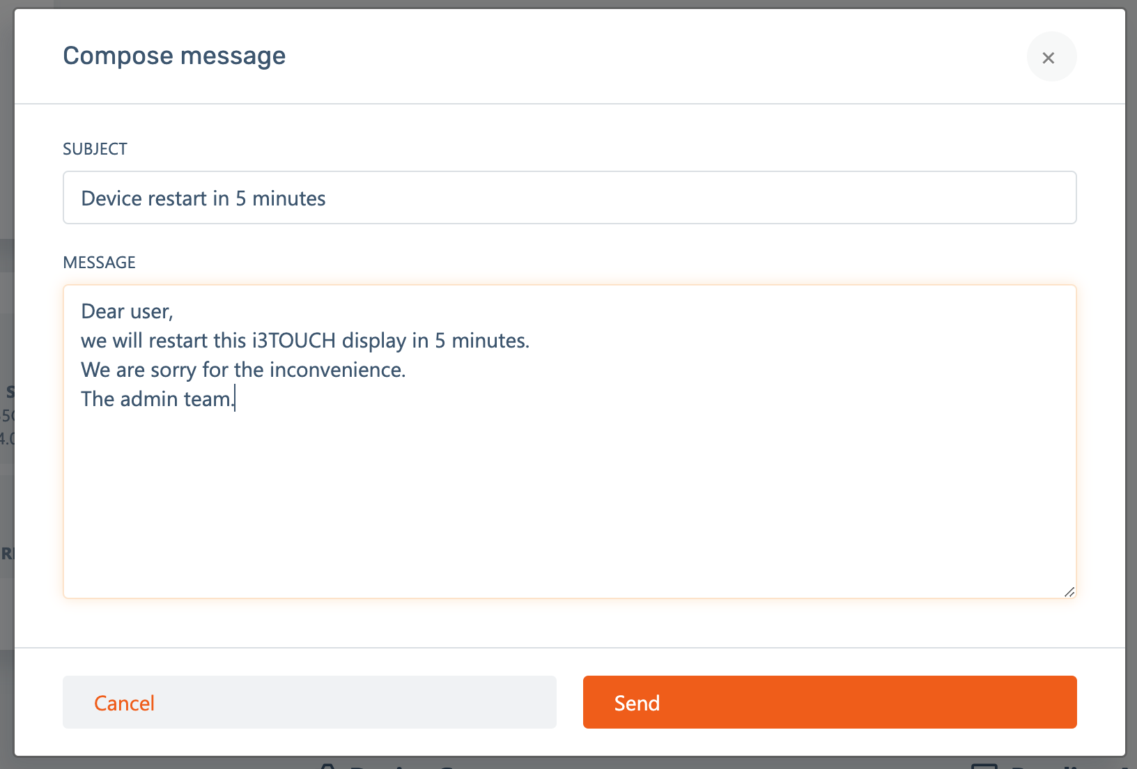 ¿Quieres enviar un mensaje a la pantalla i3TOUCH para notificar a tus usuarios de una acción próxima, como la necesidad de reiniciar la pantalla? Puedes hacerlo fácilmente con esta funcionalidad.