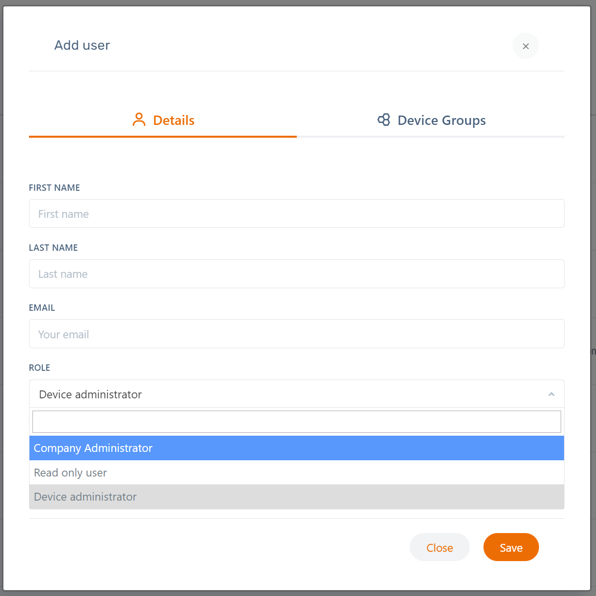 Selecting Edit will open the modal with the user details, the user role and the assigned Device Groups.