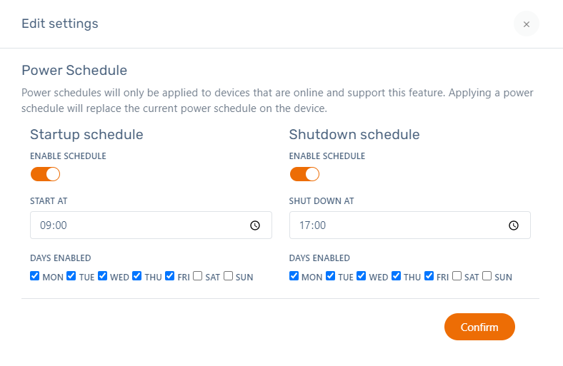 In the modal fill in the desired boot and shutdown times and check the days the schedule is active.
