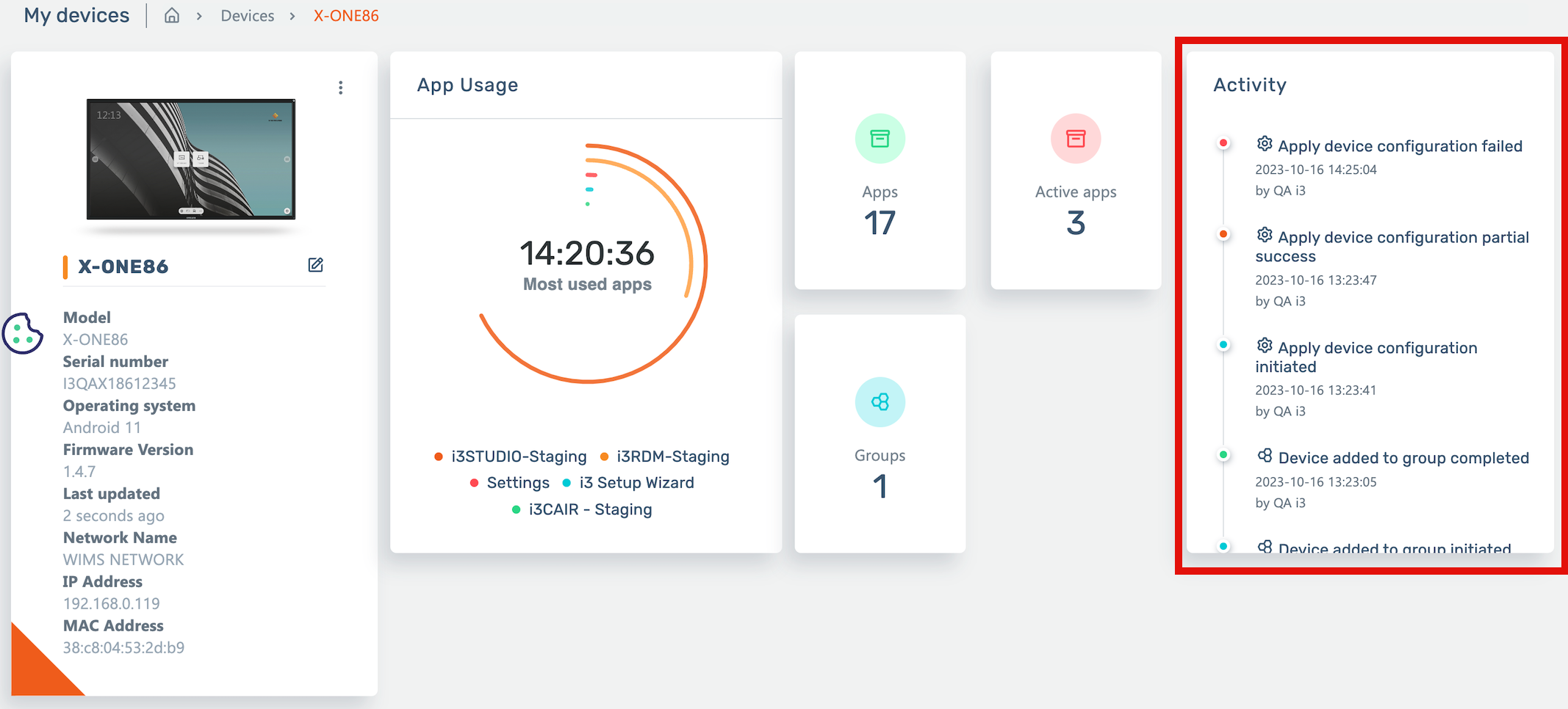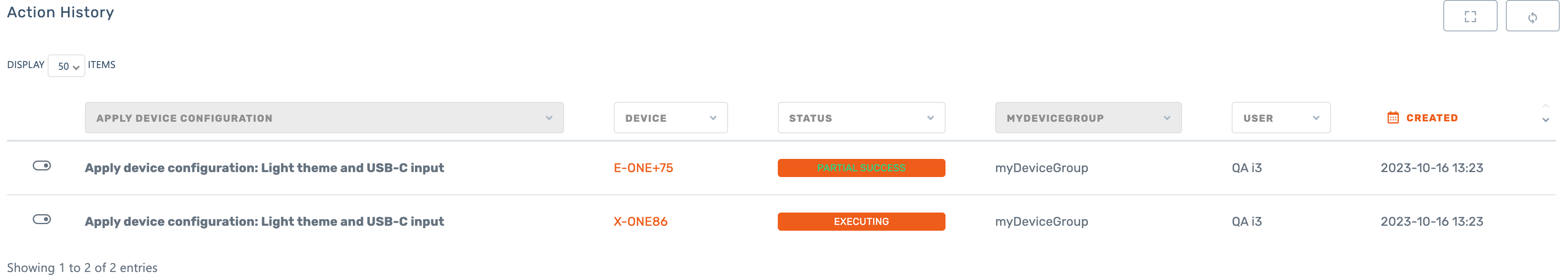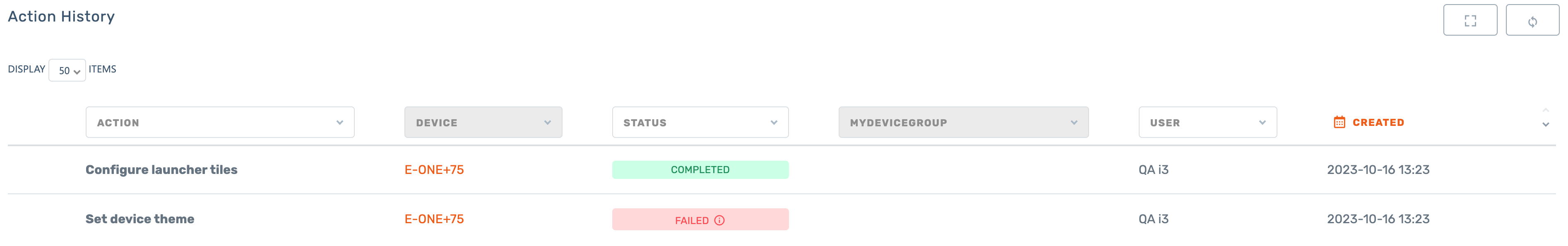 Als je op een detailpagina van een apparaat bent, toont dit overzicht alle opdrachten en configuraties die zijn toegepast op dit specifieke i3TOUCH-display. Als je op een detailpagina van een apparaatgroep bent, toont het alle opdrachten en configuraties die zijn toegepast op de apparaatgroep.