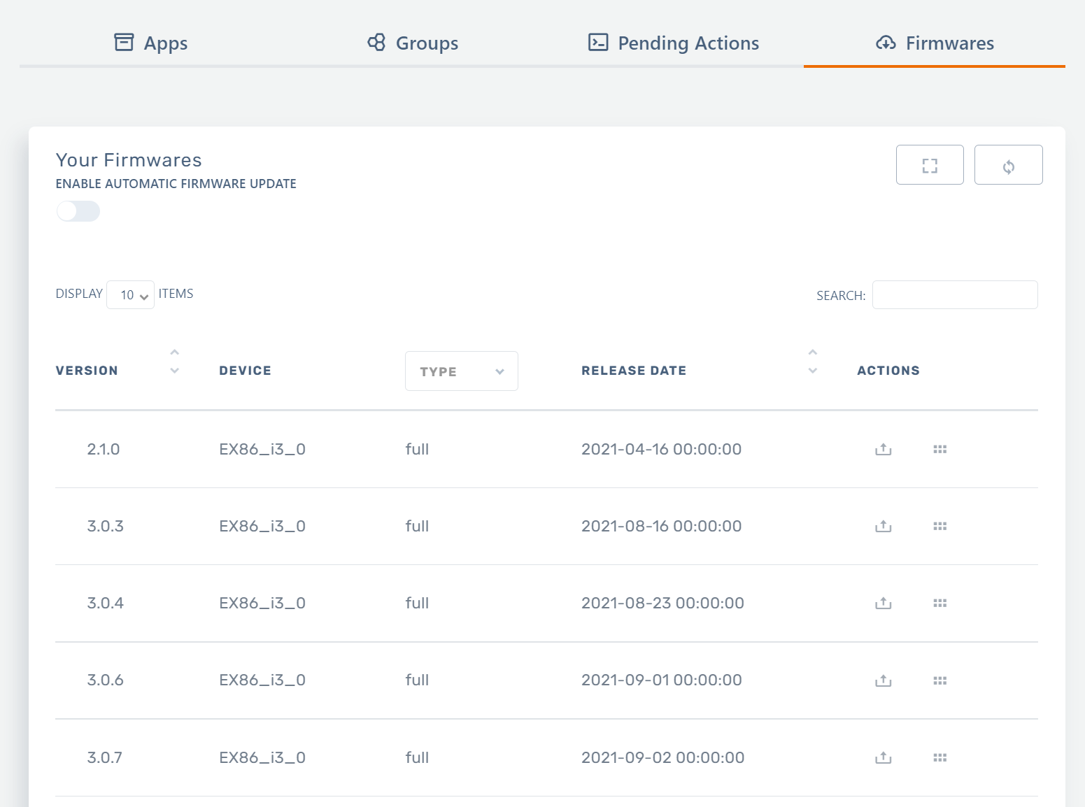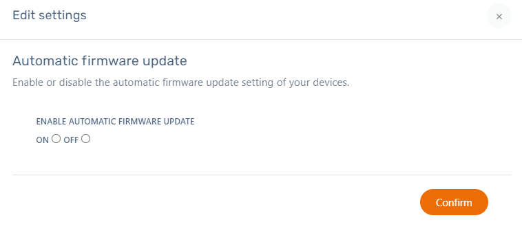 Automatic firmware updates can be toggled on and off. When this setting is disabled, the device will no longer automatically download and update new firmware updates. This can be done on the device or group overview by selecting one or more items and clicking the automatic update icon.