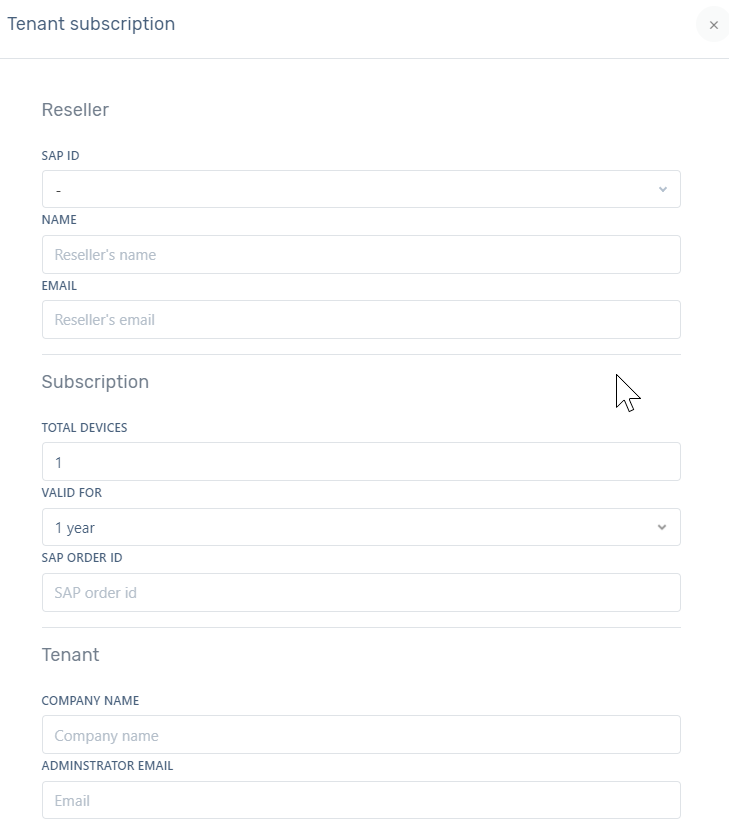 Reseller/distributor/sales person requests new tenant license (i.e. places an order) to BO (email to info@i3-technologies.com or via phone).