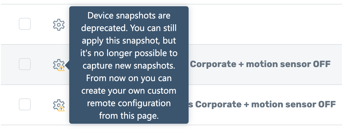 While you can still apply legacy configuration snapshots, it will display a warning. A tooltip will inform you that they will no longer be able to create new snapshots.