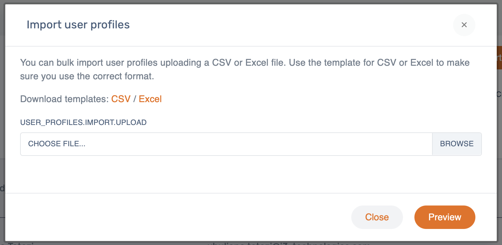 After selecting your CSV/Excel file, you can preview your import before confirming the import and user profile creation process.