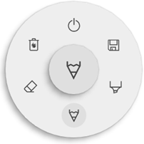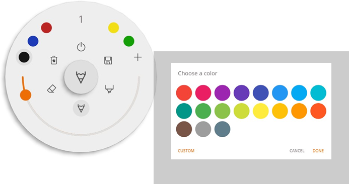 Door het selecteren van een van de canvasgereedschappen (marker, pen of gummetje) opent het een tweede niveau van opties. Elk gereedschap heeft zijn eigen opties, dus het veranderen van de dikte of de kleur van het ene gereedschap zal het niet veranderen voor het andere. De schuifregelaar wordt gebruikt voor het selecteren van de schrijfdikte van het gereedschap, het getal bovenaan geeft de geselecteerde breedte aan, variërend van 1-10. De 5 gekleurde cirkels zijn voorgeselecteerde opties om snel de kleur van de markeerstift of de pen te veranderen, de gom heeft deze optie niet.