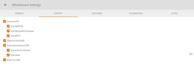 De whiteboard-applicatie ondersteunt meerdere opslag- en exportopties (instelbaar in de admin-instellingen).