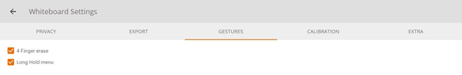 Long hold menu is disabled by default and 4 finger erase is enabled if you did the required calibration. If you enable a gesture that hasn’t be calibrated yet you will be requested to calibrate it in order to use it.