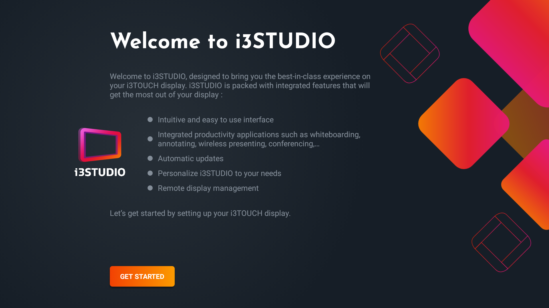 Na de installatie start het apparaat met de i3STUDIO setup wizard. Deze wizard leidt u door het proces van het configureren van uw display. Het duurt slechts een minuut, omdat de meeste van uw eerdere instellingen (zoals WiFi, enz.) worden behouden van de vorige installatie.