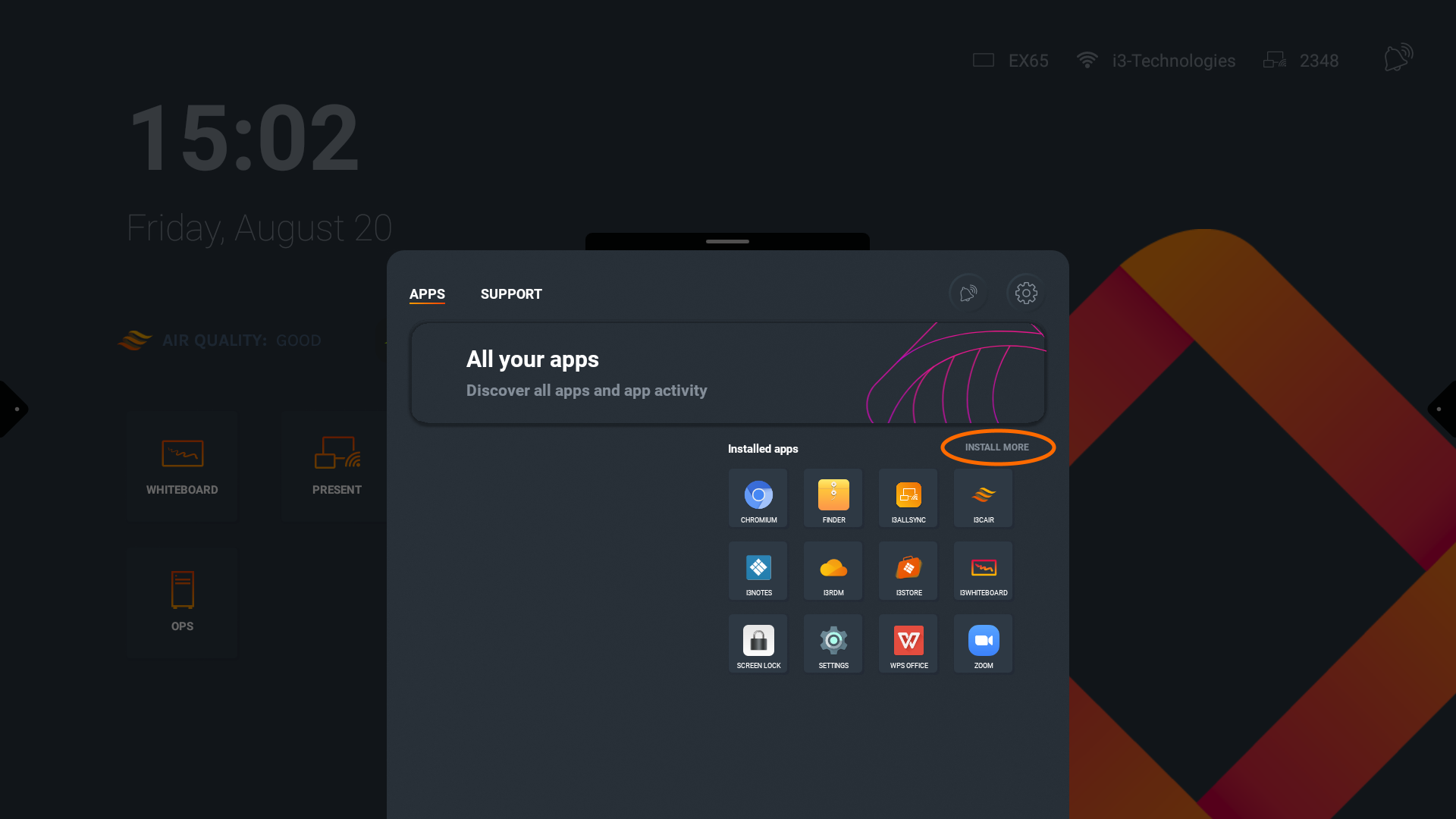 Desliza hacia arriba para abrir el menú inferior donde encontrarás una lista de las aplicaciones actualmente instaladas. En la esquina superior derecha, encontrarás el botón para "Instalar más" aplicaciones, que te llevará a i3STORE.