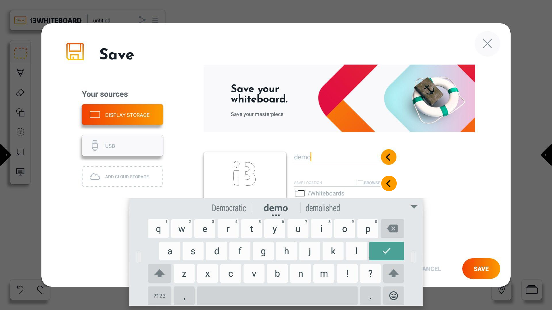 i3WHITEBOARD speichert Ihre aktuelle Sitzung automatisch, sodass Sie sich keine Sorgen machen müssen, den Fortschritt zu verlieren, wenn Sie zu anderen Apps navigieren oder von diesen zurückkehren.
