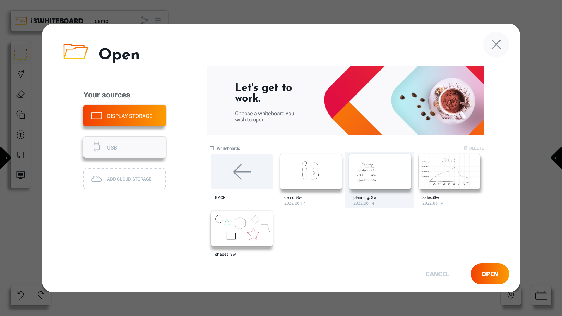 Dies ermöglicht das Öffnen zuvor gespeicherter i3WHITEBOARD-Dateien.