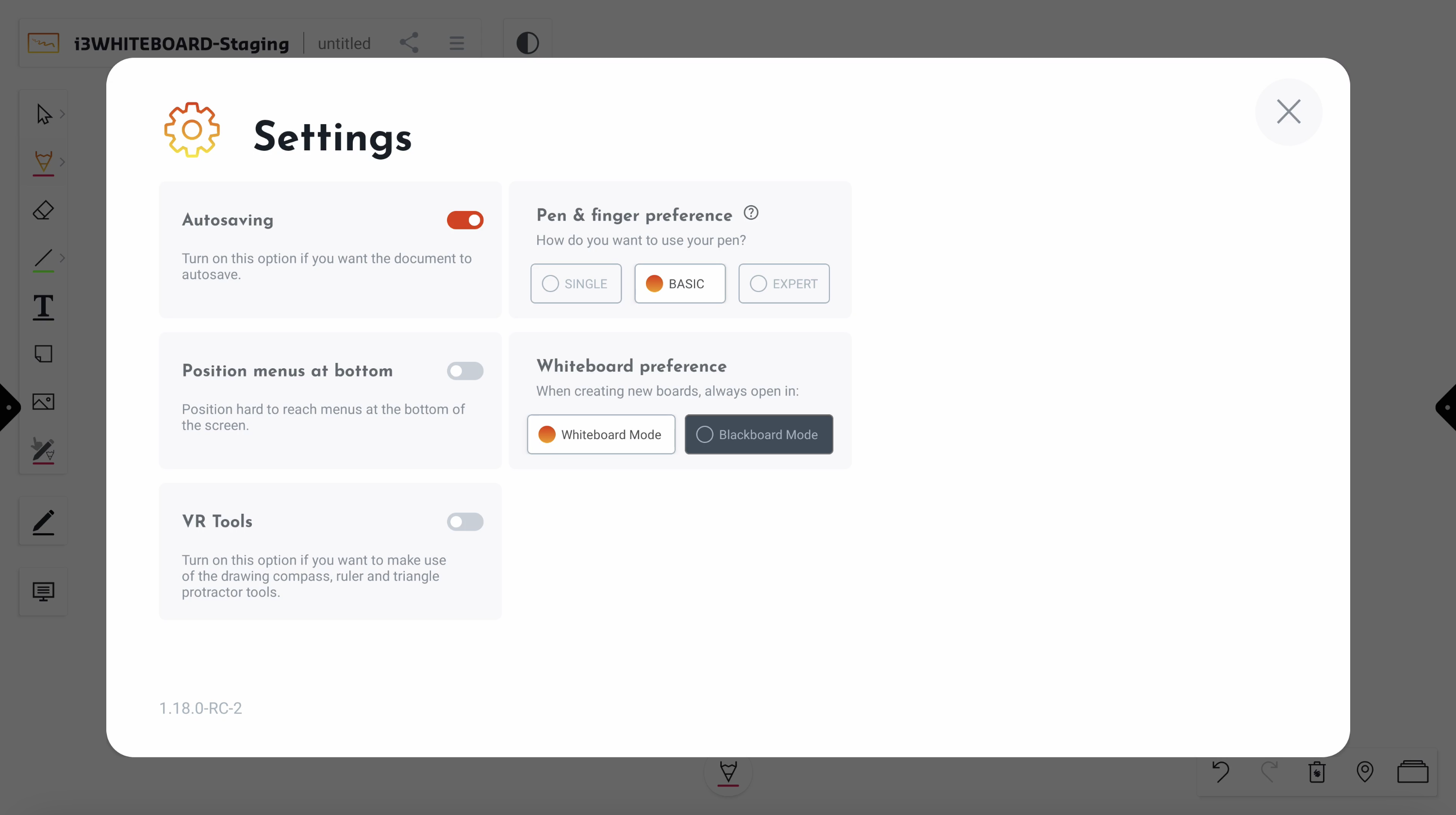 Les outils VR (triangle, règle et compas) sont désormais également disponibles pour les écrans i3TOUCH en mode Entreprise. Pour les activer, sélectionnez la bascule dans le menu Paramètres. Une icône supplémentaire apparaîtra sur le canevas dans lequel les outils sont disponibles.