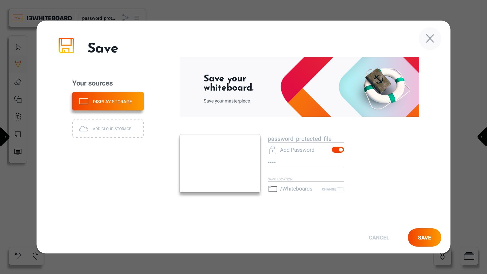 En plus d'enregistrer votre fichier i3WHITEBOARD sur le stockage de l'écran, vous pouvez également utiliser une autre source connectée comme une clé USB.