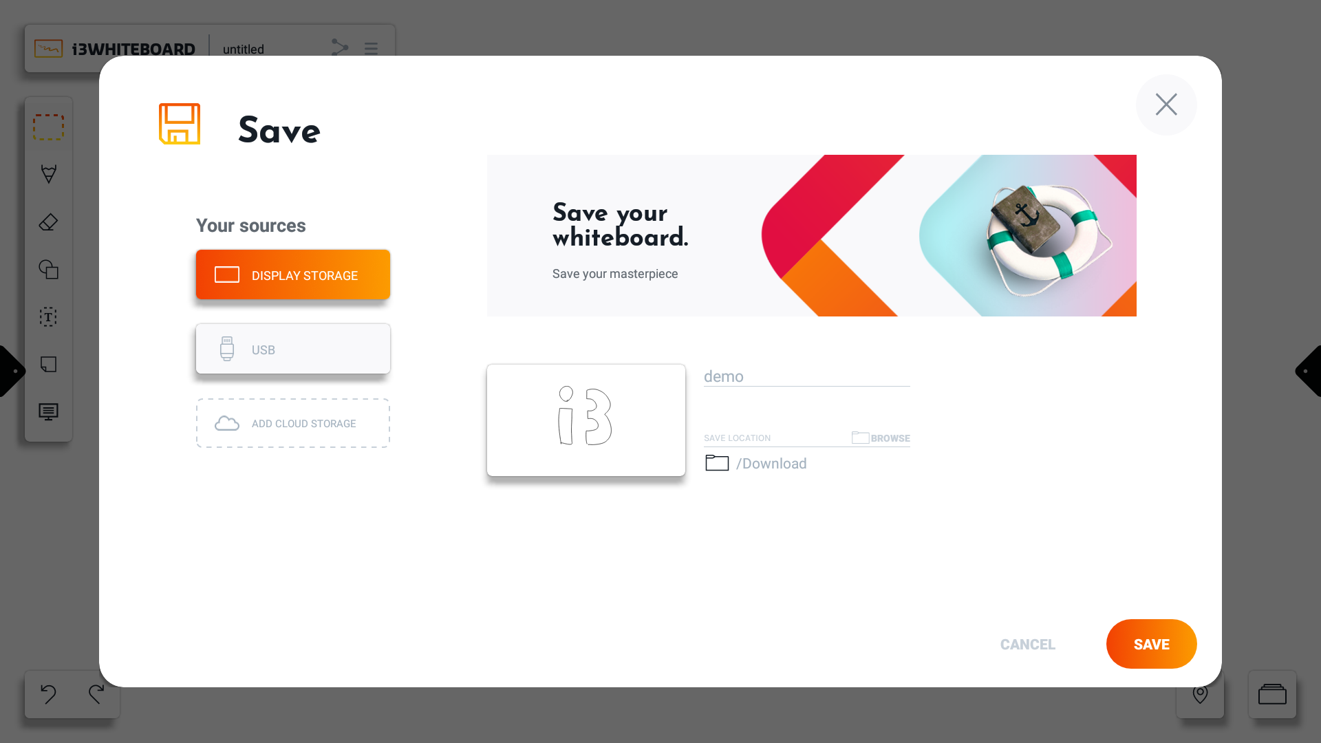 Además de guardar tu archivo de i3WHITEBOARD en el almacenamiento de la pantalla, también puedes usar otra fuente conectada como una memoria USB.