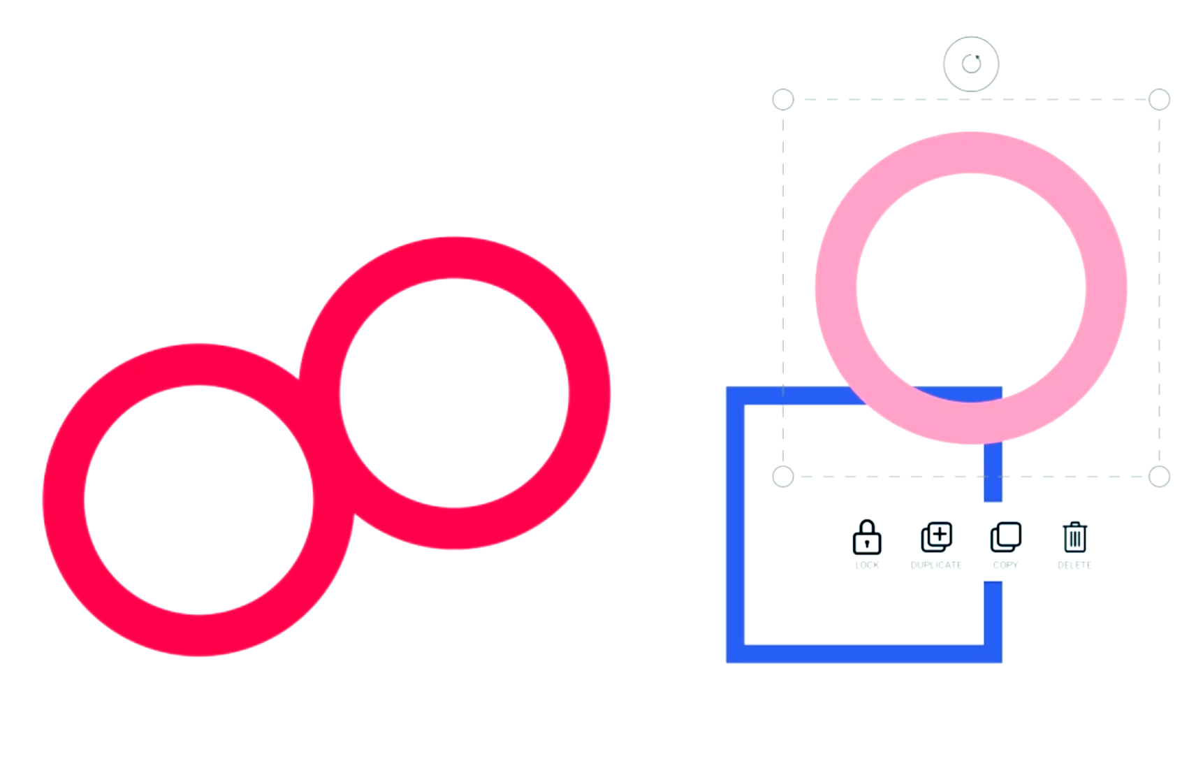 Le menu Actions est visible une fois que vous avez sélectionné un ou plusieurs objets sur la toile. Le menu Actions vous permet de verrouiller, détecter, éditer, dupliquer, copier-coller et supprimer le ou les objets sélectionnés.